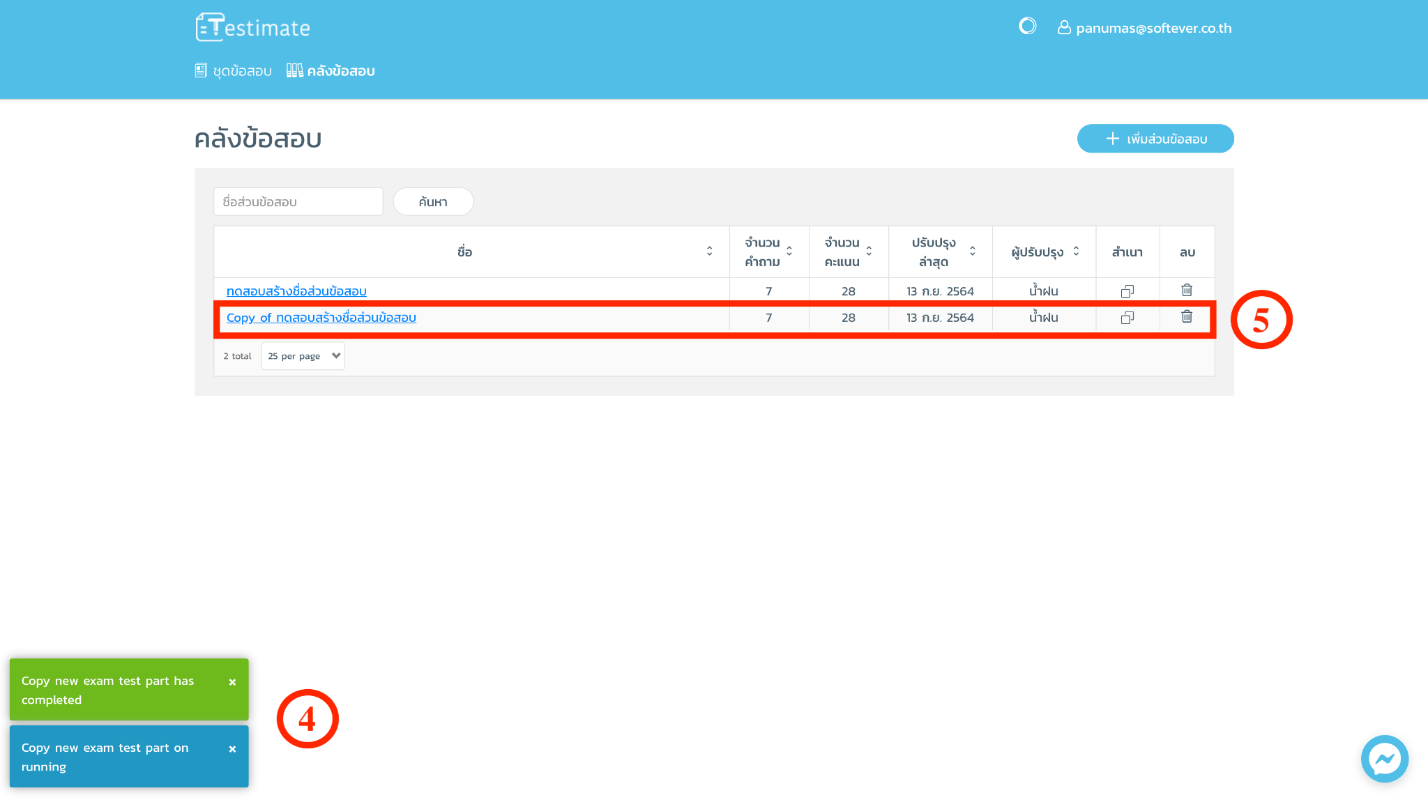 หมายเลข 4 แสดงสถานะการสำเนาส่วนข้อสอบ โดยส่วนข้อสอบฉบับสำเนาจะแสดง (หมายเลข 5) ก็ต่อเมื่อมีสถานะการสำเนาส่วนข้อสอบสำเร็จ