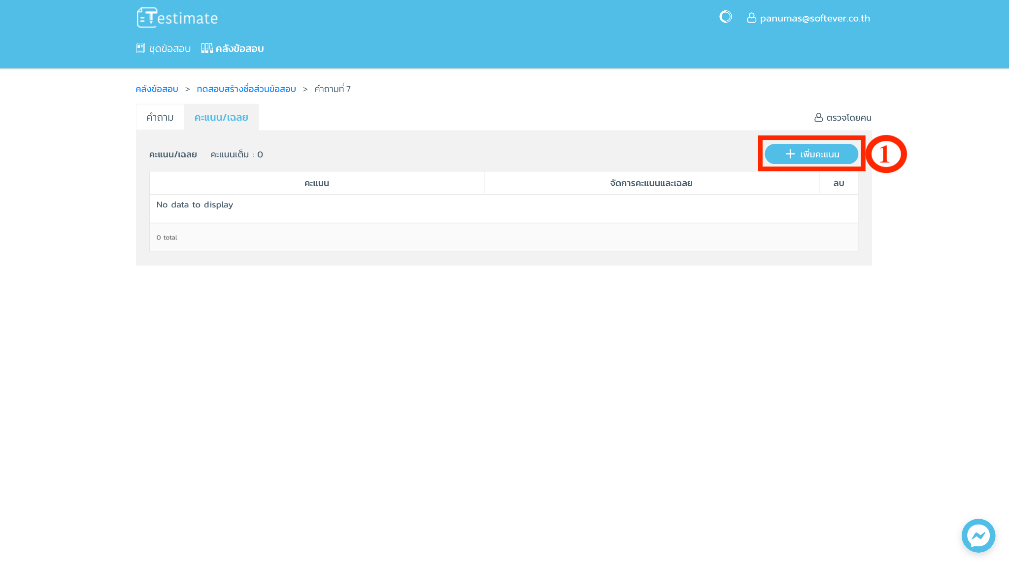 ผู้ใช้งานสามารถเข้าดูช่องทางการเข้ากำหนดคะแนนและเฉลยได้ที่ การกำหนดคะแนนและเฉลย จากนั้นให้ผู้ใช้งานคลิกที่ปุ่ม "เพิ่มคะแนน" (หมายเลข 1)