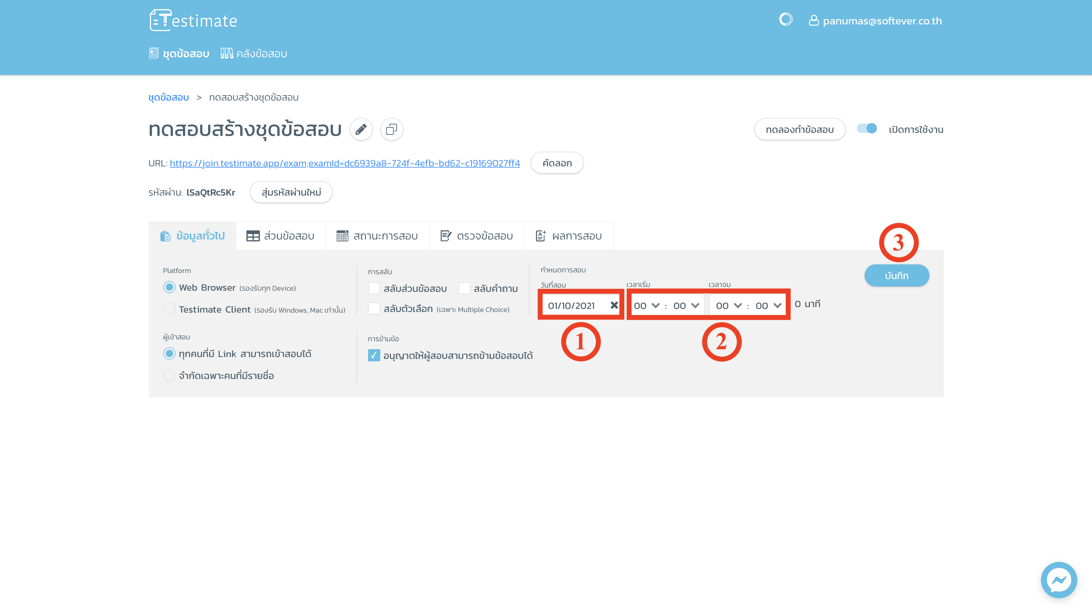 1. หากผู้ใช้งานต้องการเปิดสอบด้วยวิธีการกำหนดวันที่สอบ แนะนำให้ท่านระบุตรง "เวลาเริ่ม" และ "เวลาจบ" ด้วย
