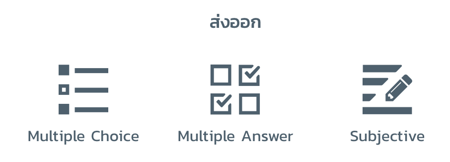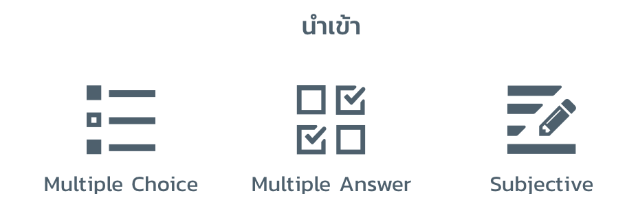การส่งออกและนำเข้าไฟล์ Template ของข้อสอบ สามารถรองรับประเภทของคำถามได้ทั้งหมด 3 ประเภท ในรูปแบบ Excel โดยมีการจำกัดขนาดไฟล์ในการนำเข้าแต่ละครั้งไม่เกิน 100MB